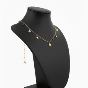 The balanced charm placement creates a graceful, lightweight look that sits beautifully on the neckline. Its soft golden finish adds warmth and sophistication, making it ideal for both casual outfits and dressy occasions. Whether worn alone or layered with other necklaces, this piece adds a refreshing and youthful charm to any look.