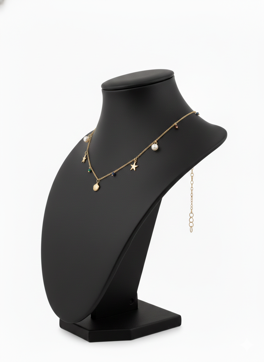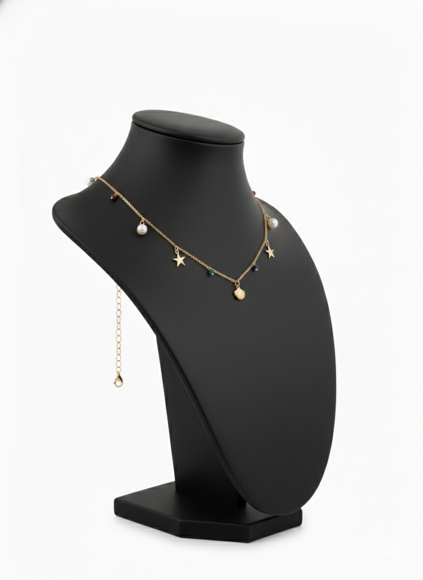 Bring coastal elegance to your everyday style with the Golden Ocean Charm Necklace. Thoughtfully designed with a fine gold-tone chain, this necklace features a beautiful mix of ocean-inspired charms including starfish, seashell motifs, luminous pearl drops, and subtle colorful bead accents.