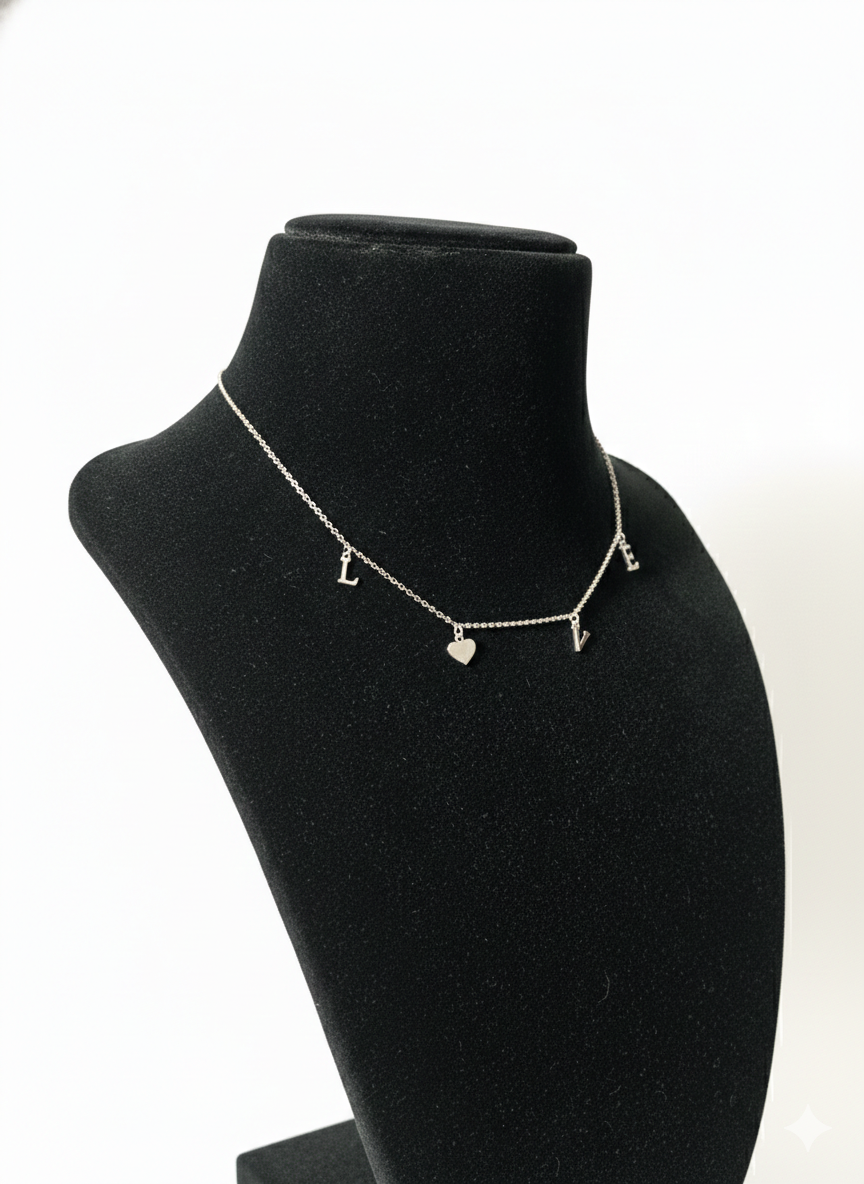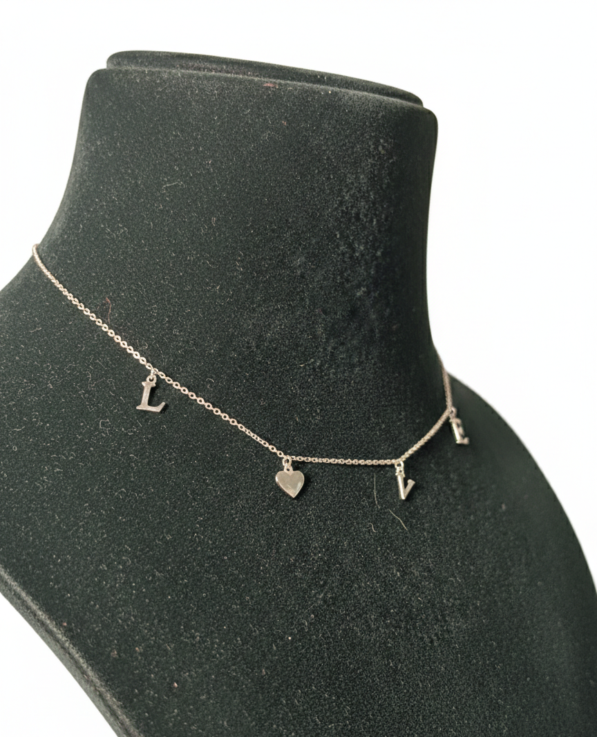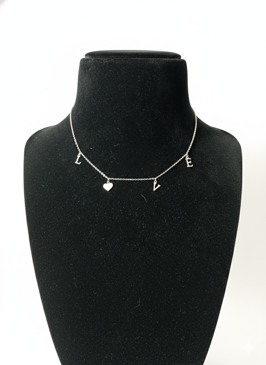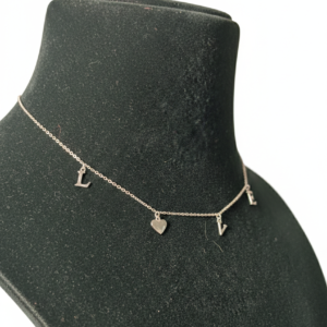 Express your style and sentiment with this sterling silver LOVE charm letter necklace. Designed with a fine silver chain, the necklace features spaced letter charms spelling “LOVE” along with a delicate heart drop pendant at the center. The balanced layout creates a playful yet elegant neckline look.